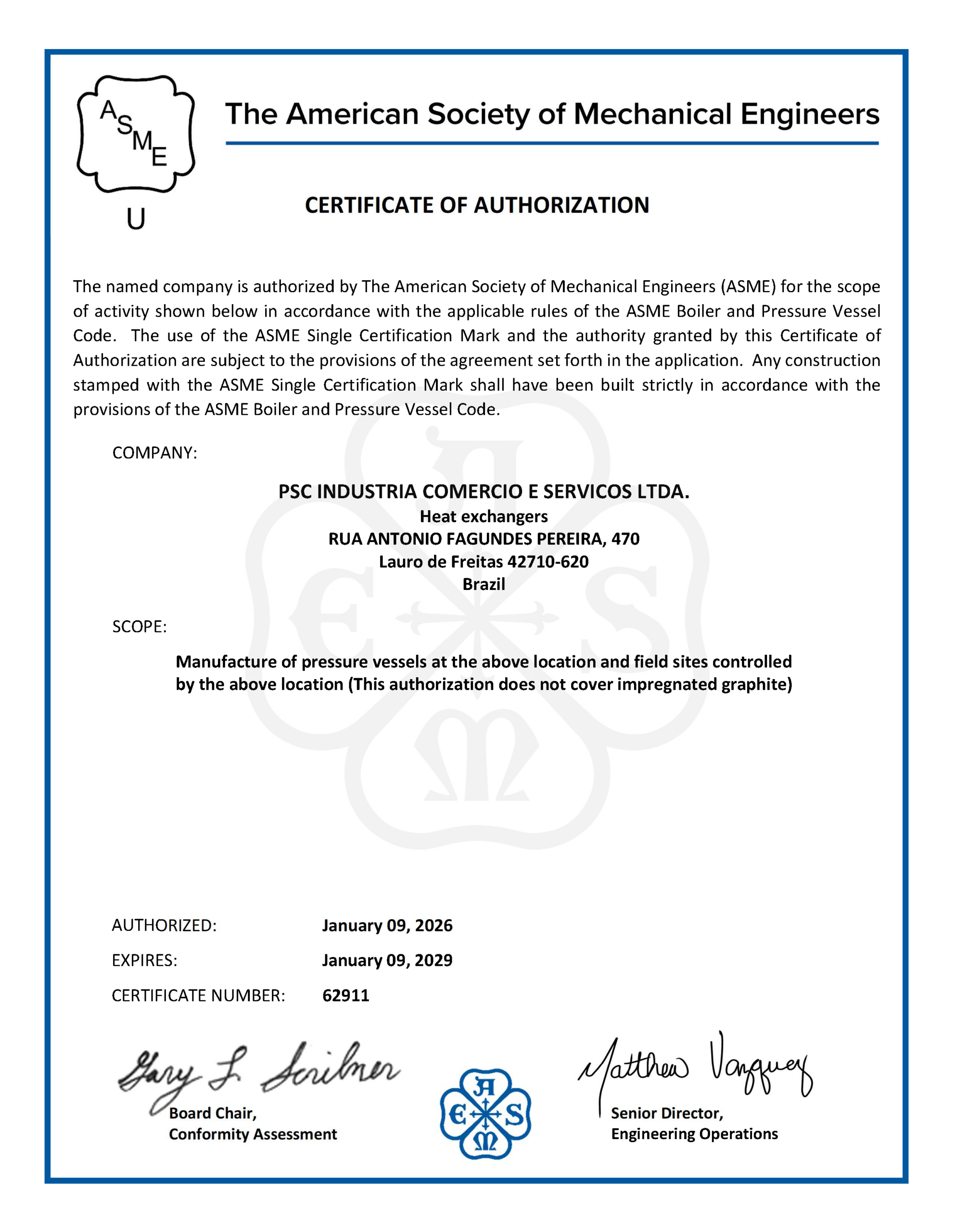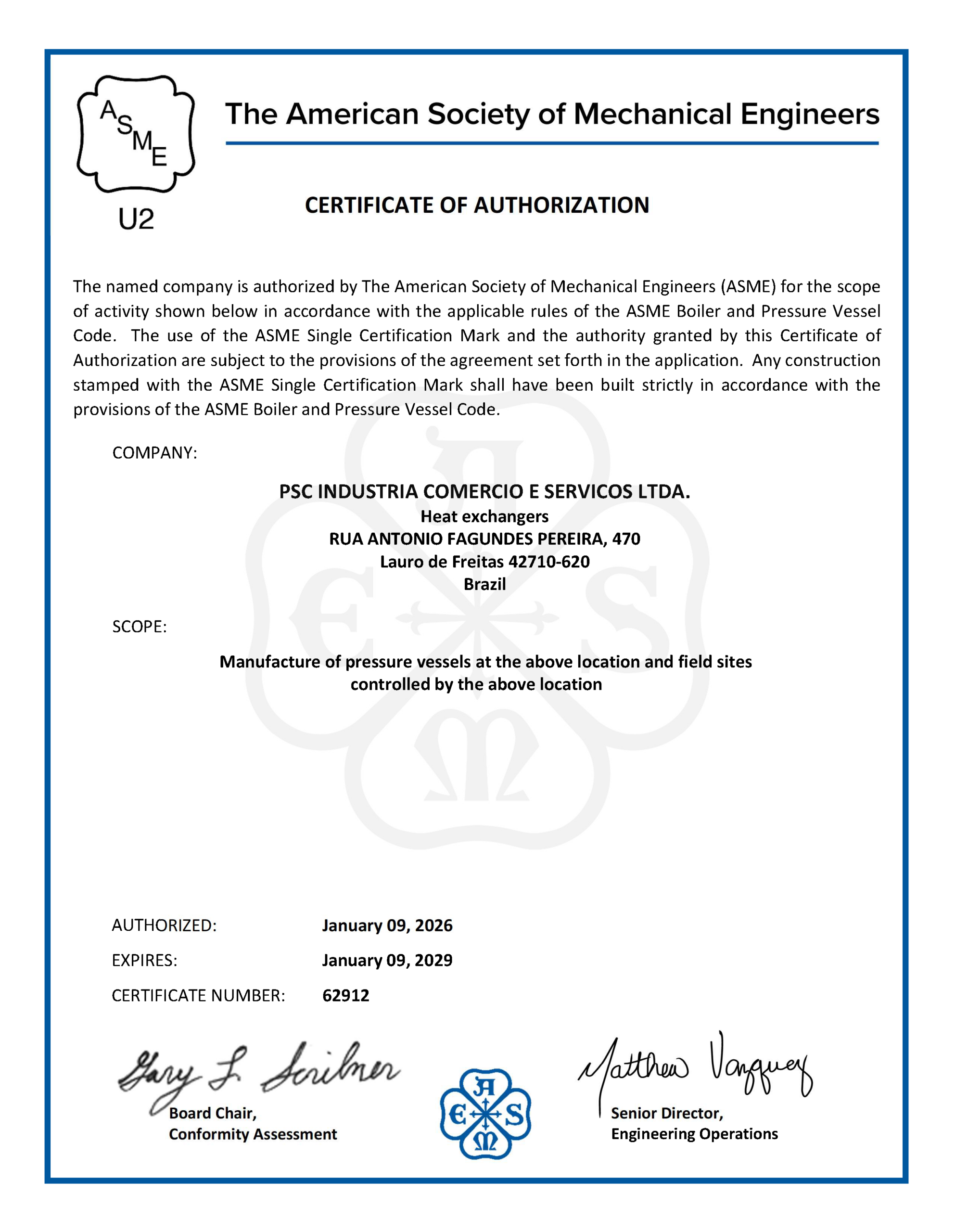 A única empresa no norte e nordeste do Brasil a ser qualificada pelo selo ASME U, U2 e R pela National Board, com muito orgulho e dedicação, conquistamos tão valorosas certificações.